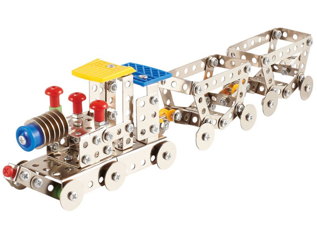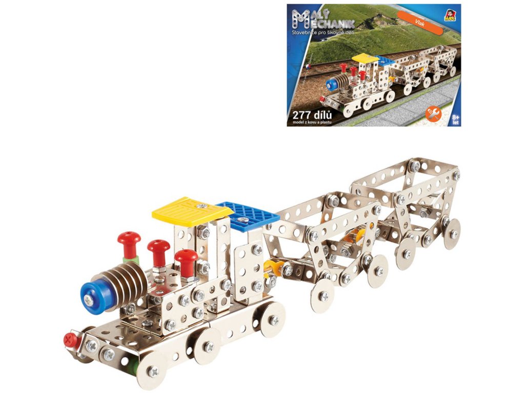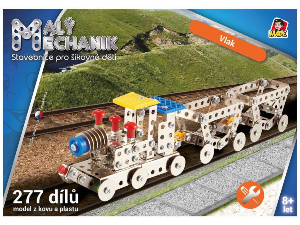 Malý mechanik: Vlaková souprava. Kvalitní dětská stavebnice typu Merkur, z kovu a plastu. Model lze sestavit ze 277 kovových součástí a plastových doplňků.Malý mechanik je označení stavebnic, které na náš drh dodává společnost MaDe. Jedná se o stavebnice na podobném principu jako legendární stavebnice Merkur, které jsou navíc obohaceny o plastové komponenty. Se