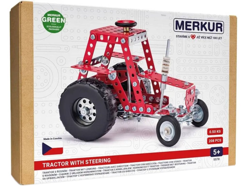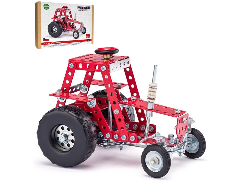 MERKUR 057 - Traktor s řízením. Kvalitní česká kovová stavebnice.Klasická stavebnice Merkur obsahuje součástky nutné pro stavbu traktoru, který lze ovládat pomocí volantu na střeše vozidla. V balení najdete podrobný návod, Merkur sadu nářadí a unikátní Merkur díly. Merkur díly jsou univerzální a tak vás neomezí v