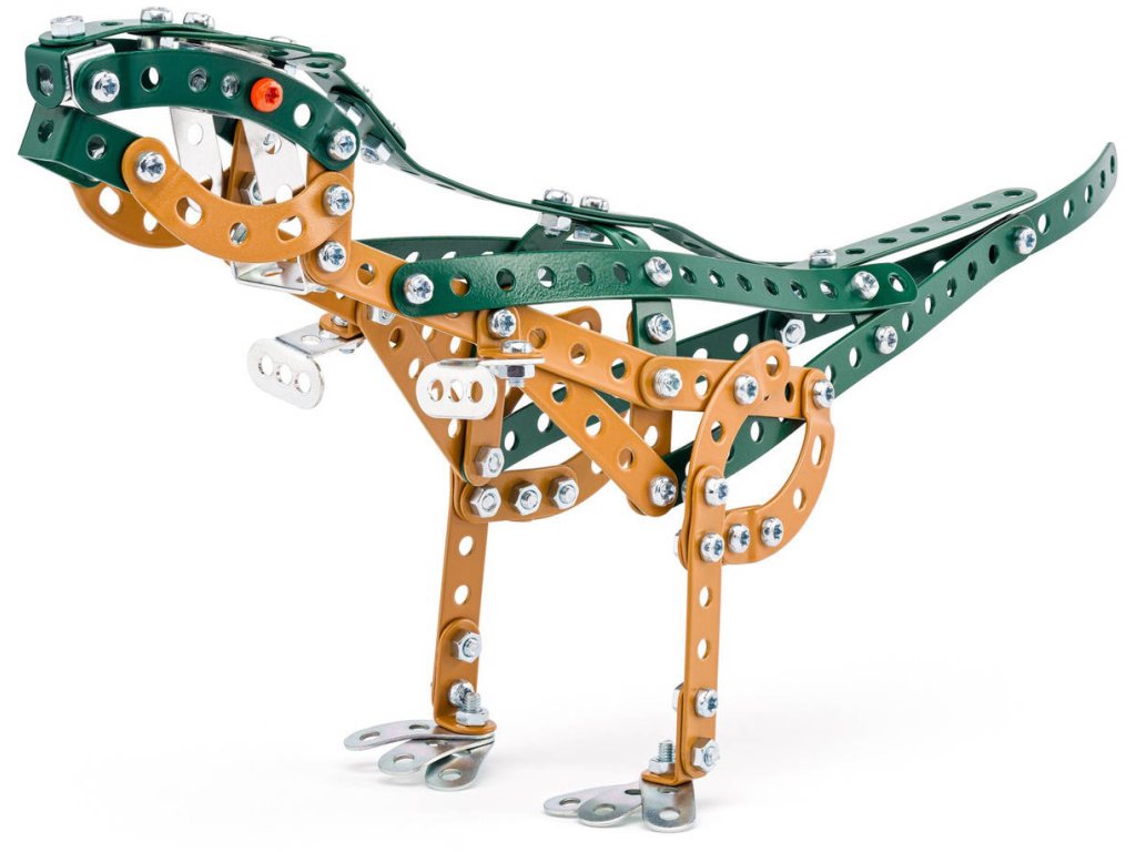 MERKUR 8098 Dinosauři: Tyranosaurus Rex. Kvalitní, kovová konstrukční stavebnice, 189 dílků, model 31cm, součástí návod + pracovní nářadí. Vyrobeno v Česku.Dinosaurus T-Rex byl dvounohý masožravec s masivní lebkou vyváženou dlouhým, těžkým ocasem. Ve srovnání s velkými a silnými zadními končetinami byly přední končetiny tyranosaura krátké, ale extrémně silné a mely špičaté prsty. Byl to jeden z posledních dinosaurů, kteří existovali před vyhynutím v období křídy a paleogenu.