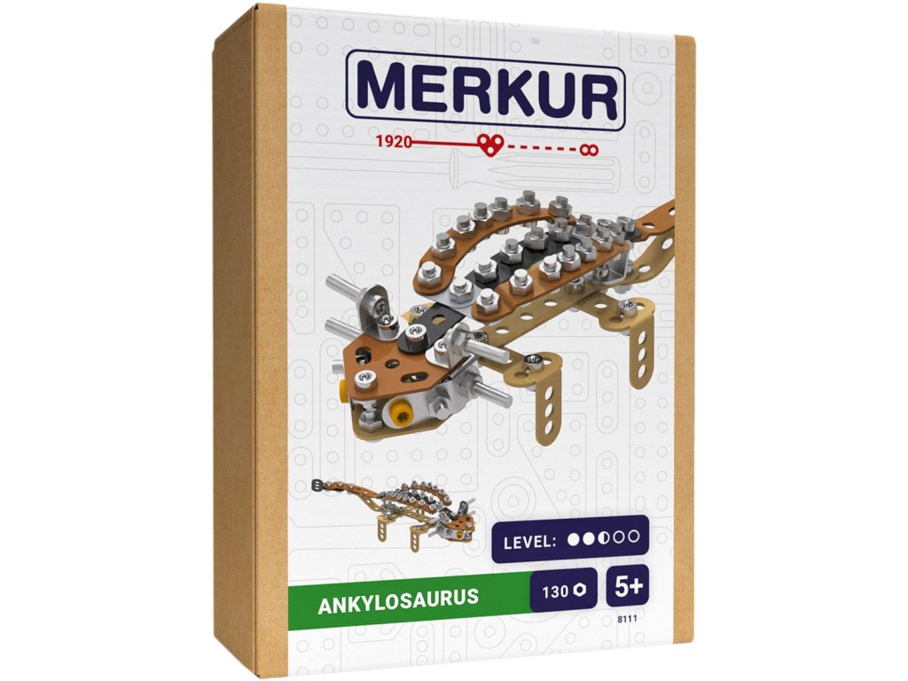 MERKUR 8111 Dinosauři: Ankylosaurus. Kvalitní, kovová konstrukční stavebnice, 130 dílků, model 20cm, součástí návod + pracovní nářadí. Vyrobeno v Česku.Kovový model pravěký ještěr Ankylosaurus z kolekce dinosaurů obsahuje součástky nutné pro sestavení tohoto modelu. V balení najdete podrobný návod, Merkur sadu nářadí a unikátní Merkur díly. Merkur díly jsou univerzální a tak vás neomezí v jakékoli modifikaci a nápadu. Stavebnici tak můžete sestavit podle přiloženého návodu nebo čistě podle svých představ. Se sestavenými modely si lze hrát, jsou velmi odolné. Podporuje a rozvíjí manuálních schopnosti, logické myšlení, soustředění.