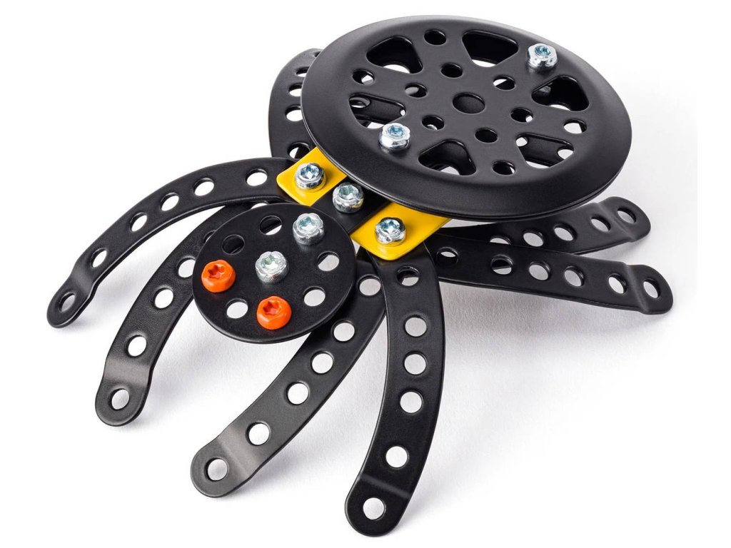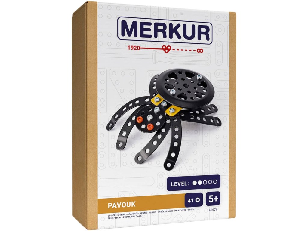 MERKUR 45574 Brouci: Pavouk. Kvalitní, kovová konstrukční stavebnice, 41 dílků, model 15cm, součástí návod + pracovní nářadí. Vyrobeno v Česku.Kovový model Pavouka z kolekce hmyzáků obsahuje součástky nutné pro sestavení tohoto modelu. V balení najdete podrobný návod, Merkur sadu nářadí a unikátní Merkur díly. Merkur díly jsou univerzální a tak vás neomezí v jakékoli modifikaci a nápadu. Stavebnici tak můžete sestavit podle přiloženého návodu nebo čistě podle svých představ. Se sestavenými modely si lze hrát, jsou velmi odolné. Podporuje a rozvíjí manuálních schopnosti, logické myšlení, soustředění.