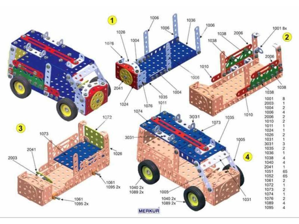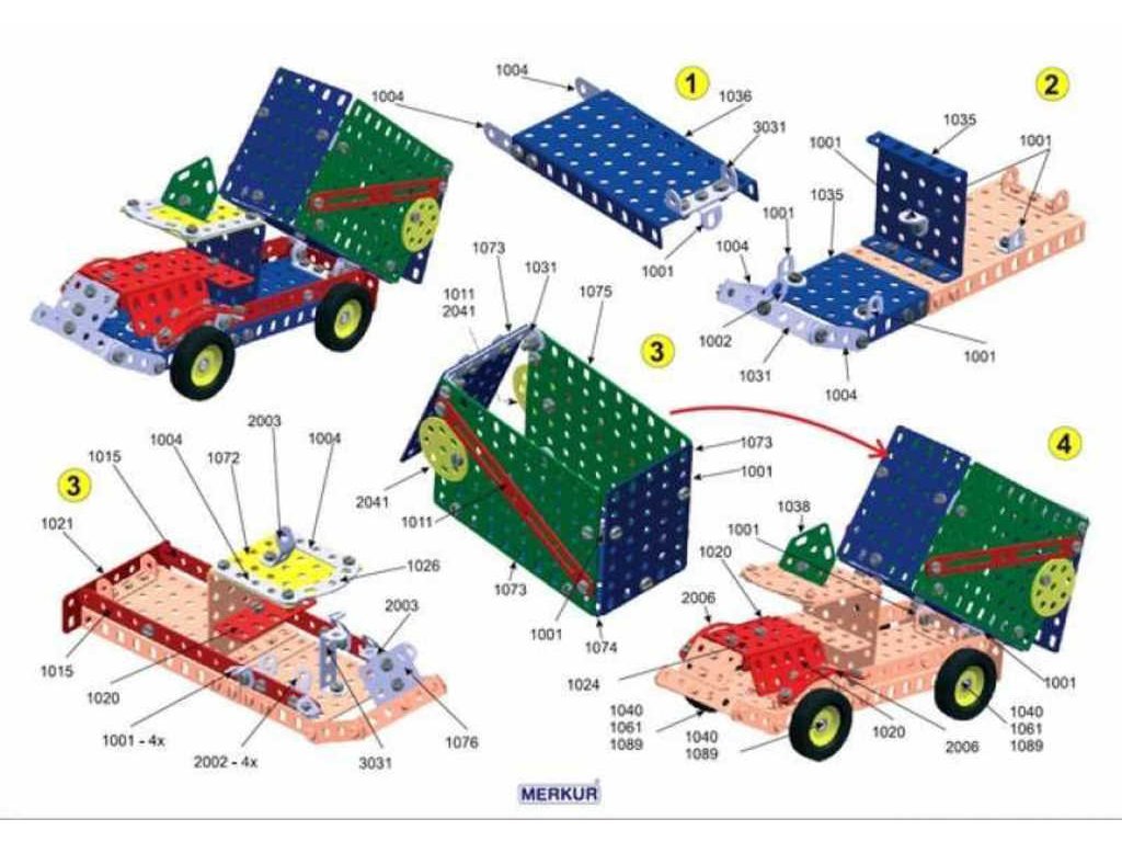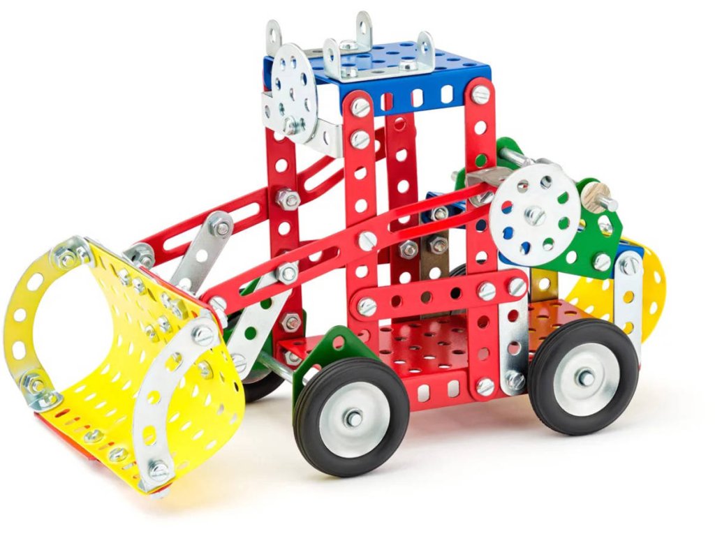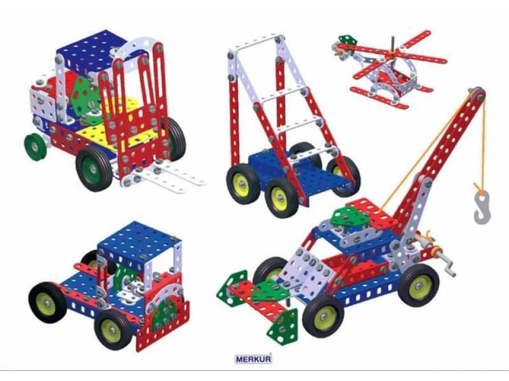 MERKUR M3 - Big set - Kvalitní kovová stavebnice vyrobená v Česku.Univerzální jednovrstvá klasická stavebnice - nejmenší z velkých stavebnic. Obsahuje základní sestavu dílů jako jsou pásky, oblouky, plotničky, úhelníky, malá kola, pneumatiky atd. včetně šroubků a