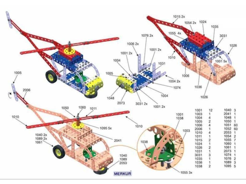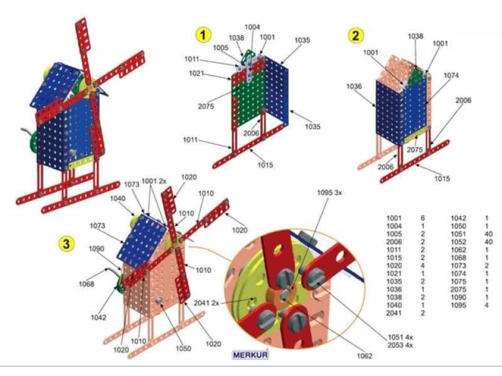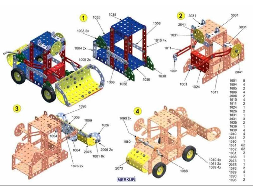 matiček. Součástí stavebnice je návodová knížka s návodem na stavbu 30 různých modelů jako je pásová pila, vagón, jeřáb, nákladní auto, výtah atd. Na začátku návodové knížky jsou popsány a