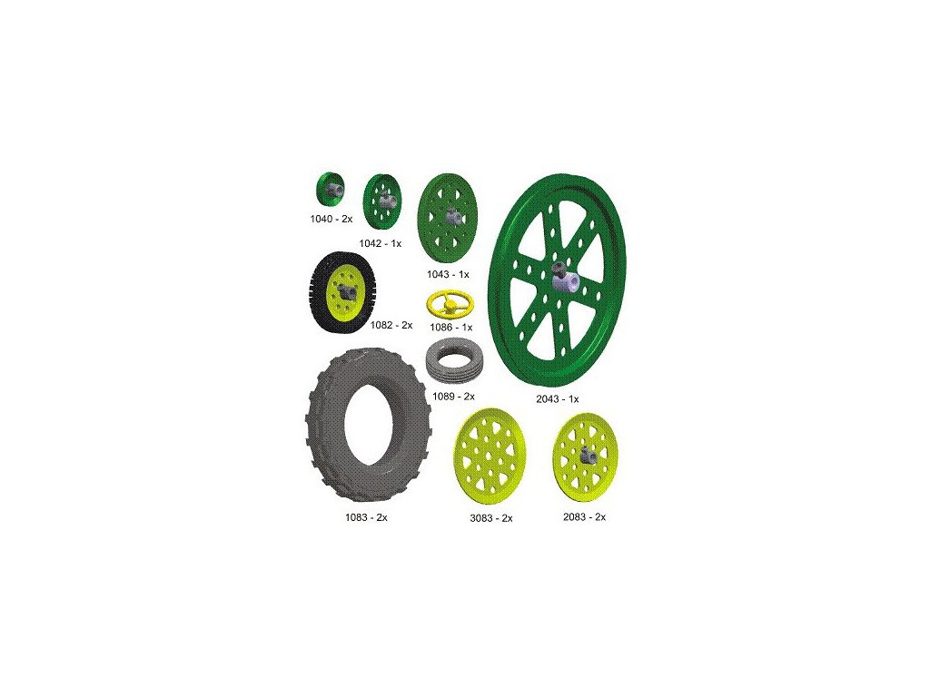 Sada náhradních kol a pneumatik ke stavebnicím značky Merkur, která obsahuje různá malá i velká kola, traktorová kola, pneumatiky a volant.