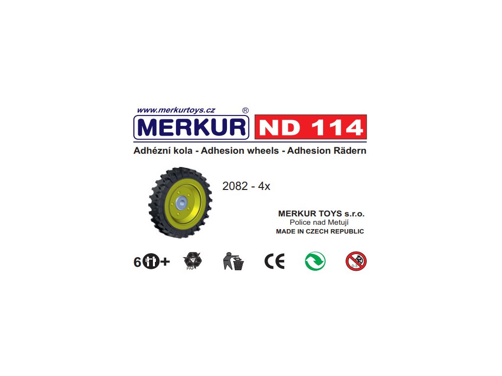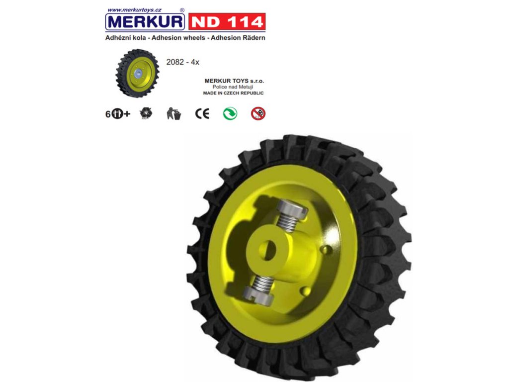 Doplňková sada 2 párů kol z plastu a kovu pro vozidla ke stavebnici Merkur. Kola mají kvalitní gumové pneumatiky.Nejznámější česká hračka Merkur. Merkur vznikl počátkem minulého století v Polici nad Metují. Tradiční česká kovová konstrukční stavebnice, ze které můžete stavět dle své fantazie nebo použít přiložený návod na sestavení nejrůznějších modelů. Všechno můžete sestavit pomocí šroubků a matiček. Tato dnes již retro hračka je stále velmi oblíbená a jistě i dospělí se rádi připojí k dětské hře a vzpomenou si tak s nostalgií na vlastní dětství s tradiční stavebnicí.