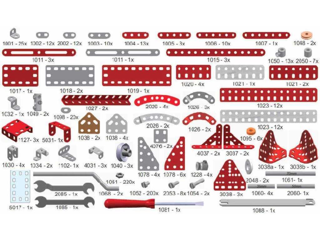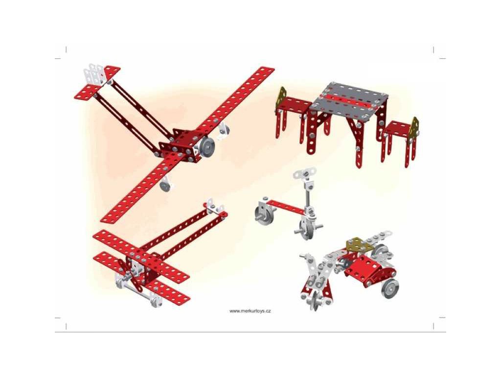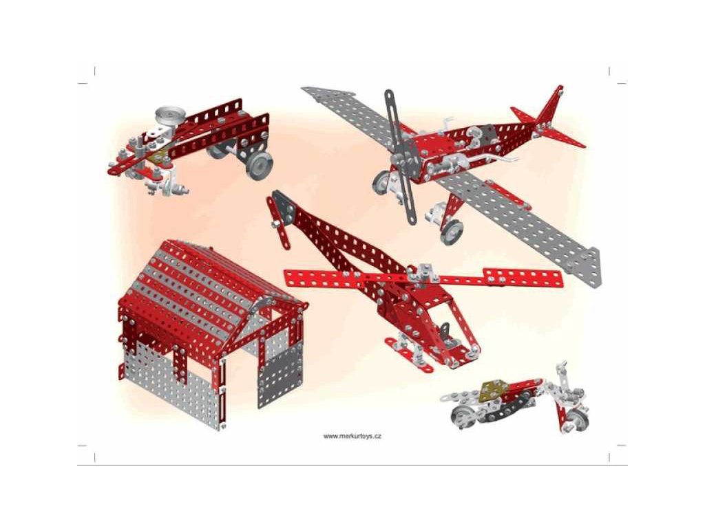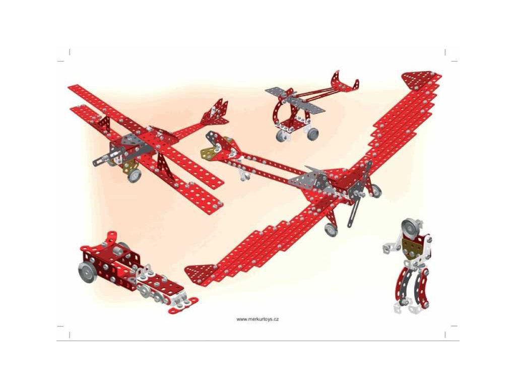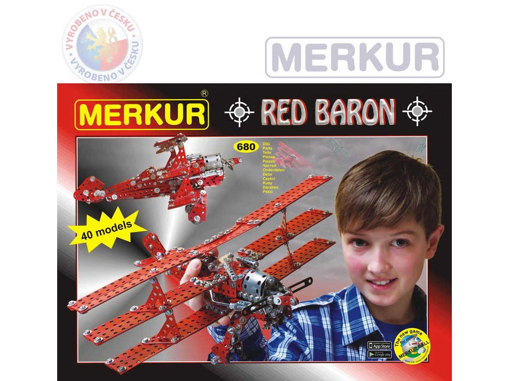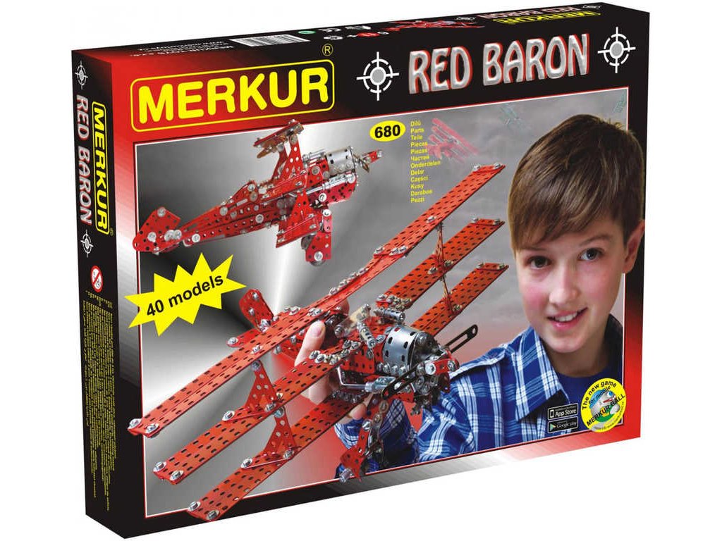 Kdo se trochu zajímá o letecké bitvy první světové války, určitě zaslechl jméno Manfred von Richthofen, známý též jako Rudý baron či Eso všech es. Byl to německý stíhací pilot a nejúspěšnější stíhač první světové války. Velel jednotce JG.1 (první stíhací eskadra) a je mu připisováno 80 sestřelů. Letadlo na titulní straně obalu naší stavebnice se stalo díky Rudému baronu nejznámějším letounem 1. světové války, byl to německý jednomístný trojplošný stíhací letoun Fokker Dr.I. Stavebnice Red Baron obsahuje návod na 40 modelů - kromě stíhacích letounů si můžete postavit průzkumné letouny, bitevní letouny, ale také transportní letoun, dům, motorku atdNejznámější česká hračka Merkur. Merkur vznikl počátkem minulého století v Polici nad Metují. Tradiční česká kovová konstrukční stavebnice, ze které můžete stavět dle své fantazie nebo použít přiložený návod na sestavení nejrůznějších modelů. Všechno můžete sestavit pomocí šroubků a matiček. Tato dnes již retro hračka je stále velmi oblíbená a jistě i dospělí se rádi připojí k dětské hře a vzpomenou si tak s nostalgií na vlastní dětství s tradiční stavebnicí.