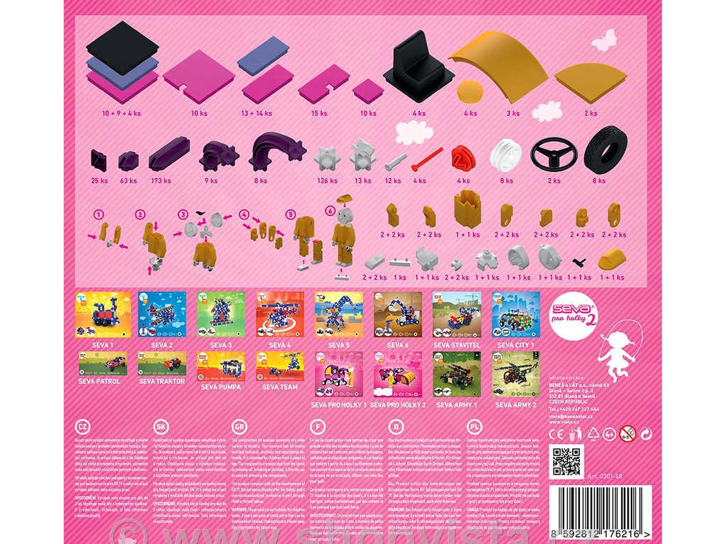 Stavebnice je určena zejména ke stavění aut pro holky sevačky. Stavebnice SEVA jsou kreativní, dětem rozvíjí mysl i manuální zručnost a její variabilita určitě osloví i Vás. Pokračování oblíbené řady stavebnic SEVA