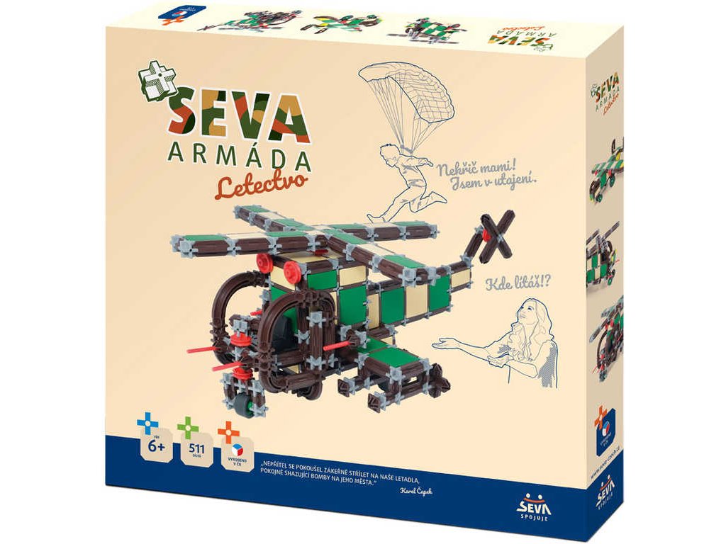SEVA - Armáda - Stavebnice ve vojenských maskovacích barvách pro malé dobrodruhy a bojovníky. Postav letadlo, vrtulník, nákladní vozidlo nebo jinou vojenskou techniku podle svojí fantazie. Pevnost výtvorůmůžeš prověřit hrou přímo v přírodě, kde si užiješ spoustu zábavy.
