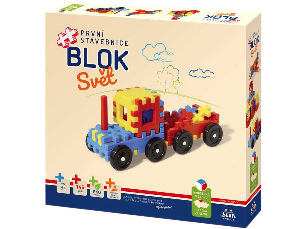 Seva BLOK: SVĚT - balení stavebnice od Visty, ze které si můžete sestavit nejrůznější modely podle vaší fantazie nebo dle vyobrazení na krabici.První stavebnice BLOK – Svět potěší ty nejmenší stavitele! Děti díky ní mohou poznat celý svět, např. se proletět nad krajinou letadlem, nebo si zajezdit po poli ve vlastním traktoru, postavit si dům, chatu či další