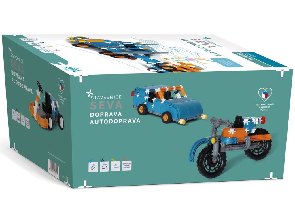 ***SEVA DOPRAVA - Autodoprava obsahuje 743 dílů. Pokud chcete ze SEVY stavět auta všech typů a velikostí, tak toto balení je určeno pro Vás. Stavebnice SEVA DOPRAVA - Autodoprava Vám přinese pořádnou dávku všech možných vozidel, auťáků, bagrů, motorek a trucků. Součástí balení je návod, který je nadupaný velkým množstvím předloh.