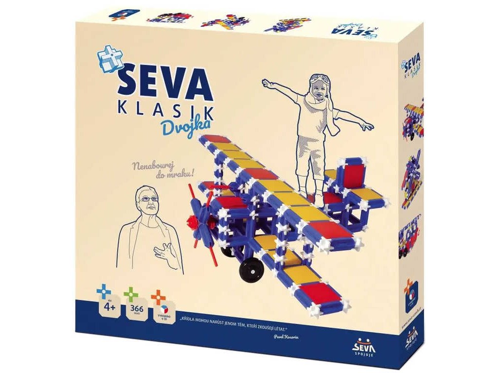 Stavebnice Seva Klasik - Dvojka.Stavebnice Seva Klasik Dvojka je variabilní polytechnická skládačka, ze které mohou děti postavit stavby i výtvory dle vlastní fantazie. Složit z této stavebnice mohou děti třeba letadlo, větrný mlýn nebo
