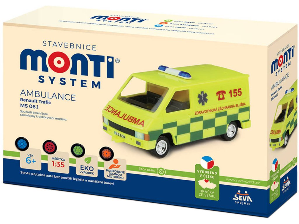 Plastový model ambulance od Sevy, z produktové řady Monti System Basic. Sestavení zacvakáváním dílků do sebe, bez použití lepidla.Dětská stavebnice Monti System 06.1 - Ambulance se sestavuje bez nutnosti použití lepidla a nanášení barev, jednotlivé díly vyrobené z barevného plastu do sebe přesně zapadají. Je jedinečná v