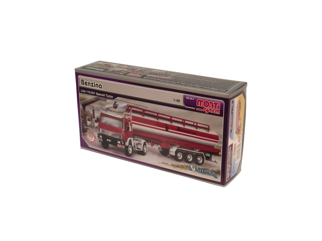 Model Monti System MS č.08.3 - Benzina je tahač Liaz s cisternovým návěsem firmy Benzina. Liaz Monti System MS 08.3 v měřítku 1:48 patří do řady modelů Monti System STANDARD, tedy mezistředně složité stavebnice.