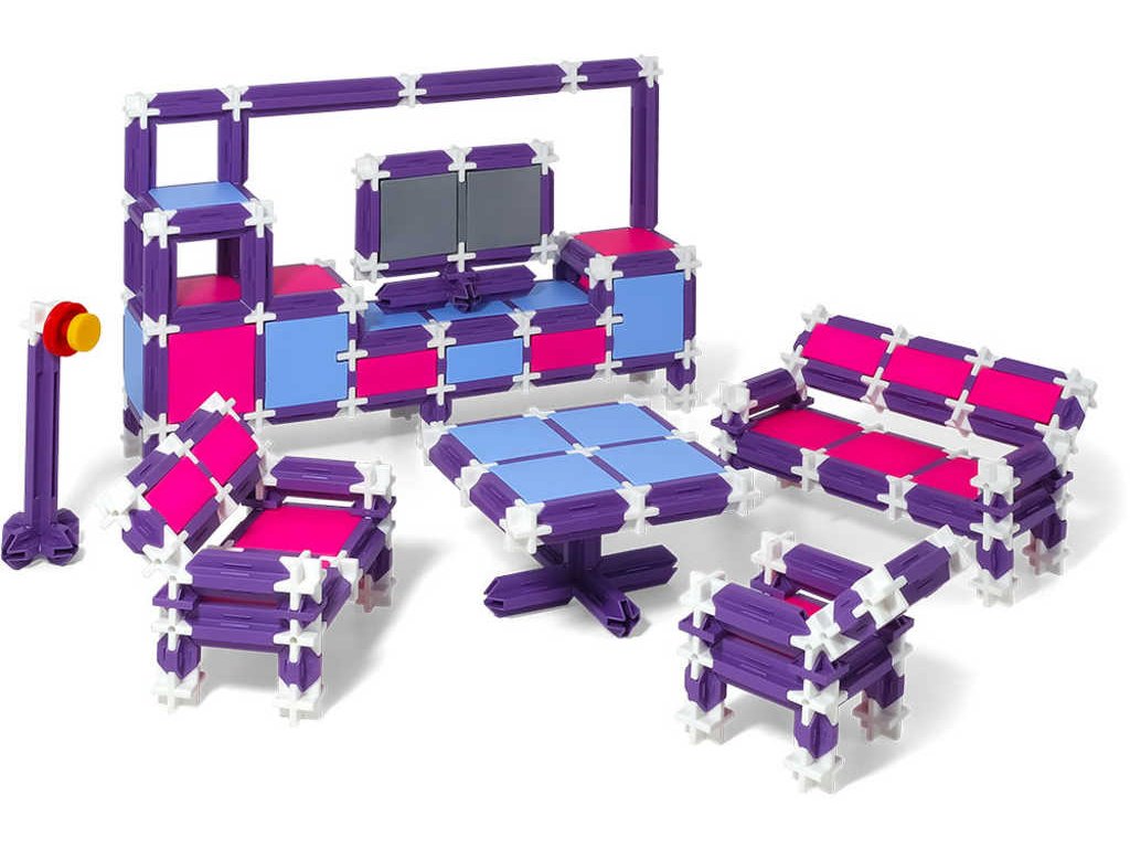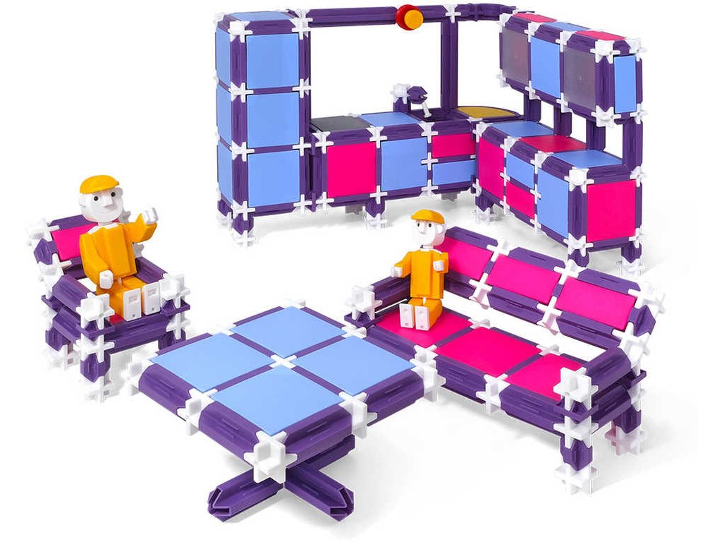 pohovkou pro dvě a tři figurky. Co by bylo bydlení bez ložnice? Ani zde nepřijdete zkrátka, můžete si sestavit tzv. letiště – širokou postýlku pro pohodlné spaní. Malé stavitelky určitě ocení i malé noční stolky u postele, kam