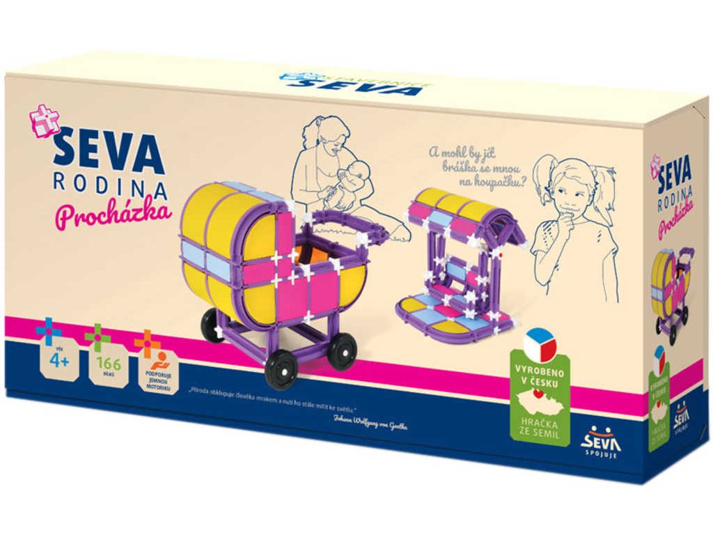 Procházka - plastová stavebnice od Sevy, z produktové řady Rodina.Pro velký zájem jsme rozšířili naši řadu SEVA Rodina o novou stavebnici zaměřenou na vše kolem procházky. Díky krásným a pestrým barevným kombinacím, kde dominuje fialová, růžová a světle modrá barva,