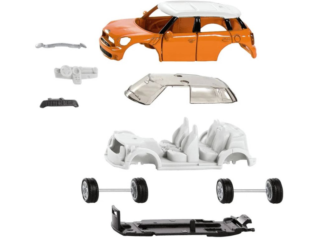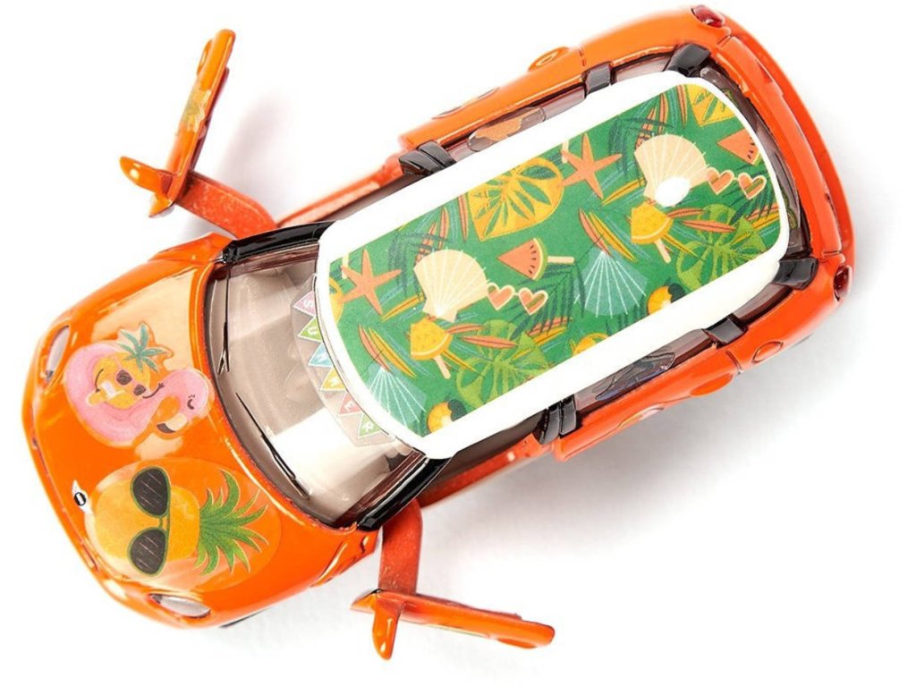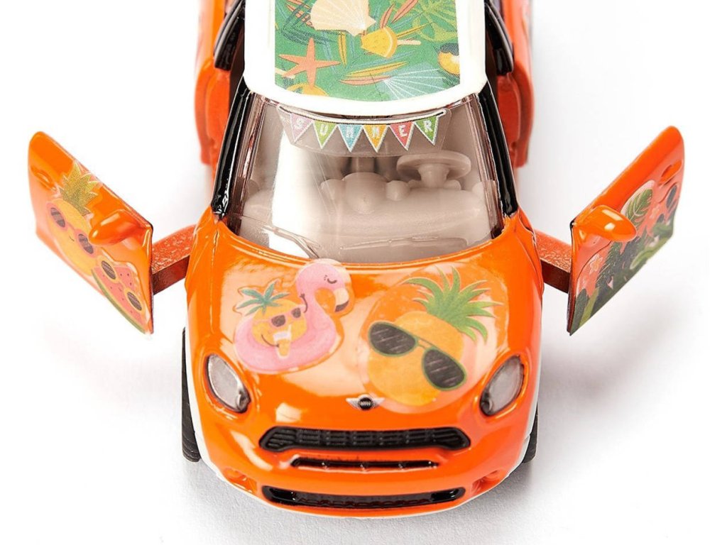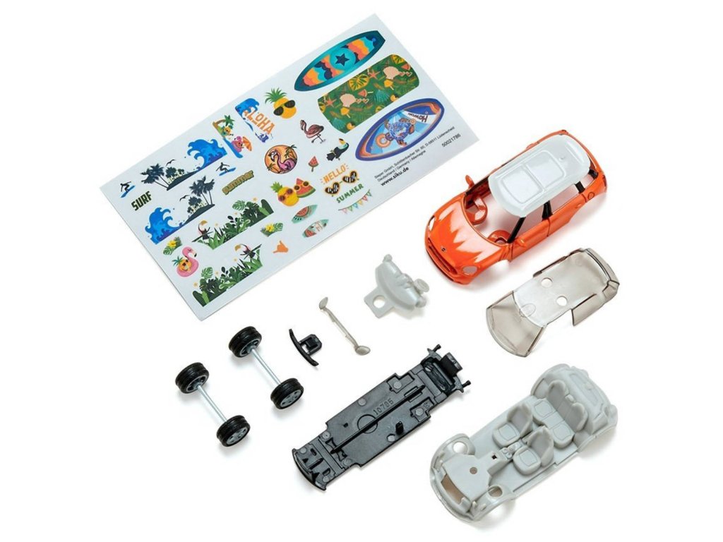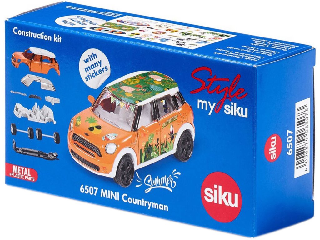 SIKU 6507 - Skládací auto stavebnice Mini Countryman Summer, oranžový osobní vůz, kvalitní kovový sběratelský model k sestavení (kov + plast). Součástí jsou samolepky.Léto, sluníčko, sluníčko! Pocit dovolené začíná, jakmile se Mini Countryman Summer rozjede! Není to jen kvůli jeho veselé oranžové karoserii, ale především kvůli dodávanému archu obsahujícímu mnoho pestrobarevných samolepek. S typickými letními motivy, jako jsou palmy, slunce, racci, surfaři a šplouchání vody, lze tento model během okamžiku proměnit v trendy prázdninový rychlík. Nejprve je však nutné jej sestavit, protože pro ještě větší zábavu je vůz dodáván z několika dílů s kovovou karoserií, sportovními ráfky a otevíracími dveřmi. Tyto části prostě potřebují přitlačit k sobě a pak je Mini Countryman Summer připraven k rychlému otočení na pláž!