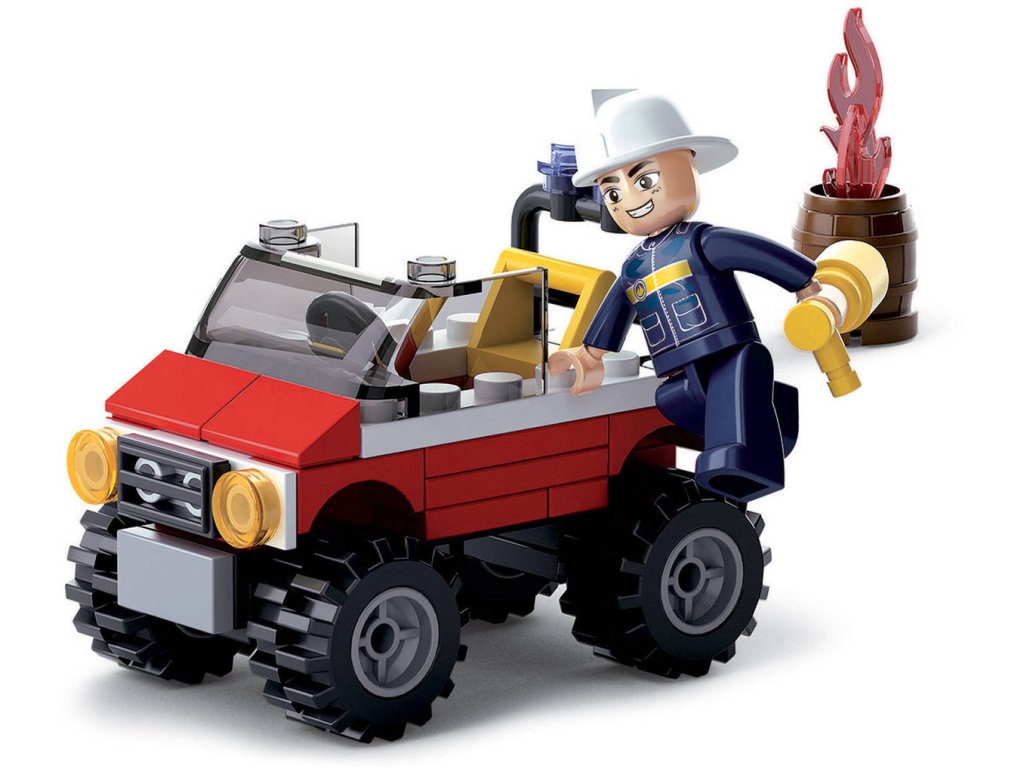 SLUBAN Fire (M38-B0621) Požární auto džíp. Kvalitní plastová stavebnice. Lze kombinovat s většinou ostatních známých stavebnic. Součástí 1 figurka.Stavebnice Sluban je možno kombinovat s podobnými stavebnicemi mnoha dalších známých značek. Dílky jsou vyrobeny z certifikovaného nezávadného a odolného ABS plastu. Přesně do sebe zapadají a drží. Výrobce má svůj inovativní vývojový tým a budete překvapeni kvalitním zpracováním jak dílků, tak figurek. Zejména figurky jsou pýchou firmy Sluban. Mají realistický tvar, hlavičku i zápěstí na pohyblivém kloubu, v pase se otáčejí o 360° a nožičky jsou pohyblivé ve směru chůze a zároveň si zachovaly plnou kompatibilitu s kostičkami. Je to malá figurka s velkou budoucností.