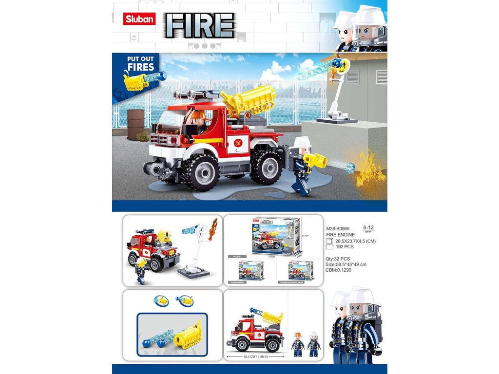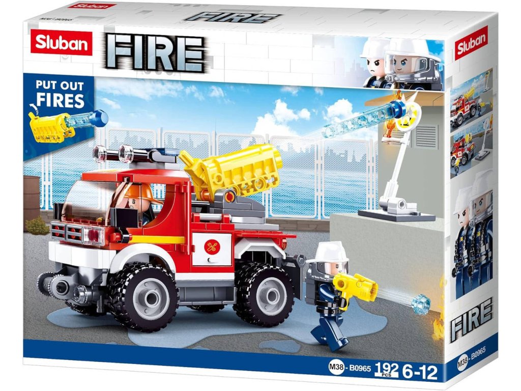 SLUBAN Fire (M38-B0965) Hasičský vůz off-rad auto s vodním dělem. Kvalitní plastová stavebnice. Lze kombinovat s většinou ostatních známých stavebnic. Součástí 2 figurky.Hasičský vůz Off-rad s vodním dělem. Vodní dělo opravdu střílí dílky ve tvaru vody. Stavebnice ze série Sluban Hasiči obsahuje 192 dílků, jednu figurku, nálepky a tištěný návod. Stavebnice Sluban pro malé i velké. Postav si svůj vlastní příběh!