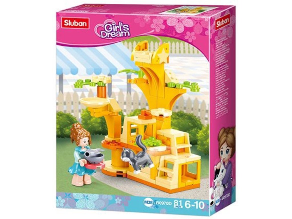 SLUBAN Girls Dream (M38-B0970D) Cvičiště pro kočky. Kvalitní plastová stavebnice. Lze kombinovat s většinou ostatních známých stavebnic. Součástí 1 figurka.Cvičiště pro kočičky je v krásně zářivé, žluté barvě se schůdky a stupínky. Součástí je kromě zvířátka také figurka cvičitelky, která má pro kočičku po výcviku připravenou odměnu v podobě ryby na misce. Stavebnice ze série Sluban Girls Dream pro holky obsahuje 81 dílků, figurku, kočičku, nálepky a tištěný návod.