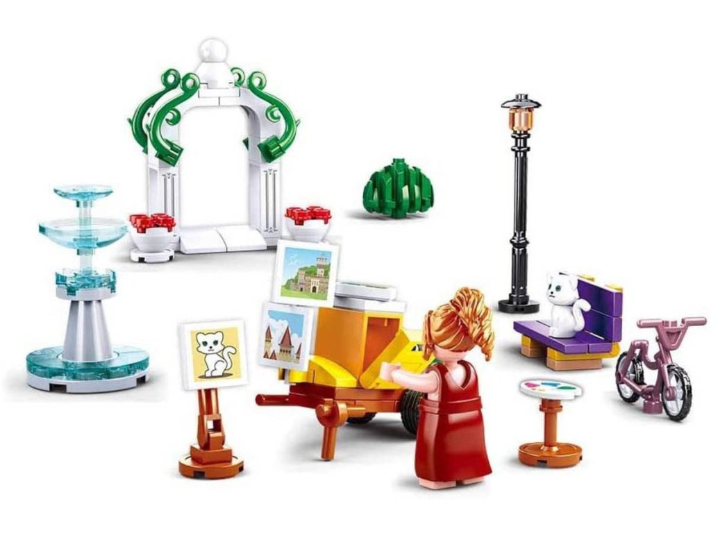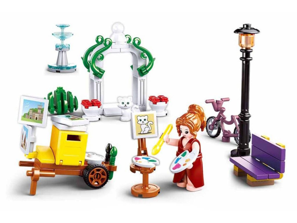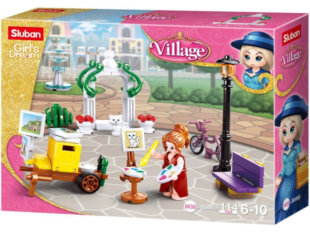SLUBAN M38-B0869 Malířka v parku z kolekce Girls Dream Village. Kvalitní plastová stavebnice. 114 dílků + 1 figurka. Lze kombinovat s většinou ostatních známých stavebnic.Stavebnice Sluban je možno kombinovat s podobnými stavebnicemi mnoha dalších známých značek. Dílky jsou vyrobeny z certifikovaného nezávadného a odolného ABS plastu. Přesně do sebe zapadají a drží. Výrobce má svůj inovativní vývojový tým a budete překvapeni kvalitním zpracováním jak dílků, tak figurek. Zejména figurky jsou pýchou firmy Sluban. Mají realistický tvar, hlavičku i zápěstí na pohyblivém kloubu, v pase se otáčejí o 360° a nožičky jsou pohyblivé ve směru chůze a zároveň si zachovaly plnou kompatibilitu s kostičkami. Je to malá figurka s velkou budoucností.