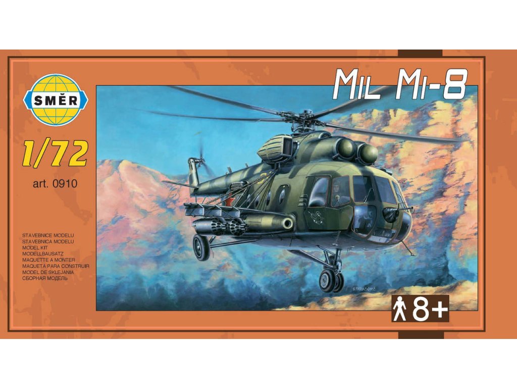 SMĚR 0910 - helikoptéra Mil Mi-8. Modelářská plastová stavebnice. Model vrtulníku určený ke slepení. 121 dílků. Velikost modelu 29,5 x 25cm.Mil Mi-8 (v kódu NATO "Hip") je v SSSR vyvinutý víceúčelový dvoumotorový vrtulník klasického uspořádání s pětilistým nosným a třílistým vyrovnávacím rotorem. Je jedním z nejrozšířenějších vrtulníků na světě. První prototyp pokusného stroje V-8 ještě poháněný jedním motorem AI-24V a čtyřlistým rotorem (Hip-A) vzlétl 9. června 1961, prototyp konečné dvoumotorové verze (Hip-B) pak 17. září 1962. Vrtulník byl v roce 1964 vybaven větší rotorovou hlavou a sériová výroba byla zahájena koncem roku 1965. Stroj se vyrábí dodnes a sloužil nebo slouží zhruba v 50 státech celého světa (včetně České republiky). Stroj našel využití jak pro vojenské, tak i civilní účely.