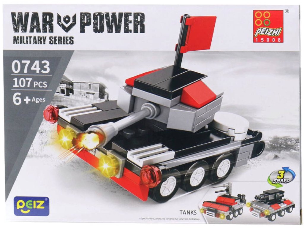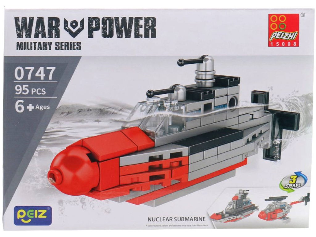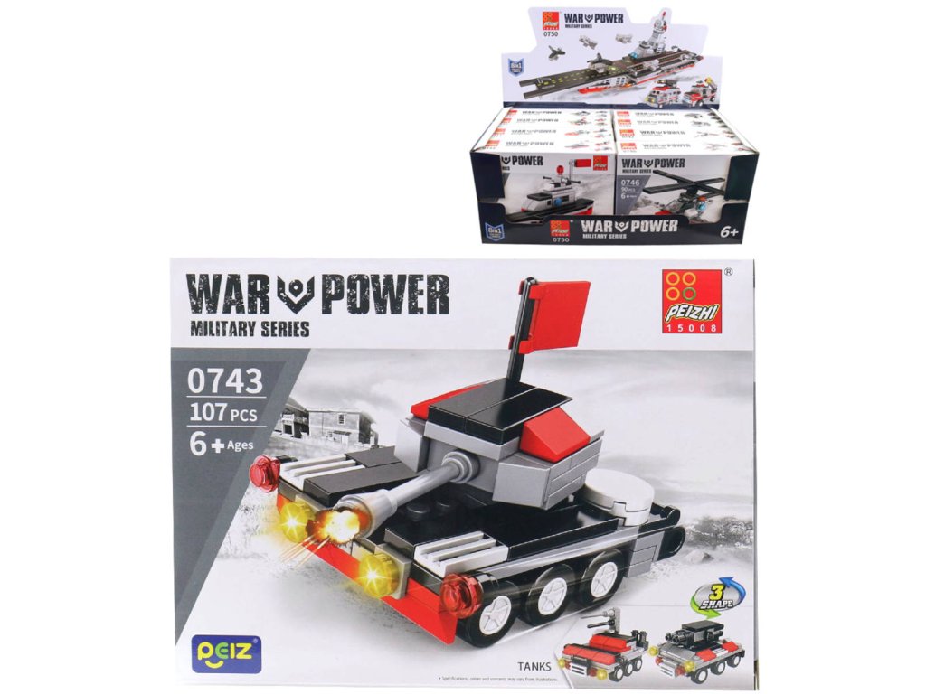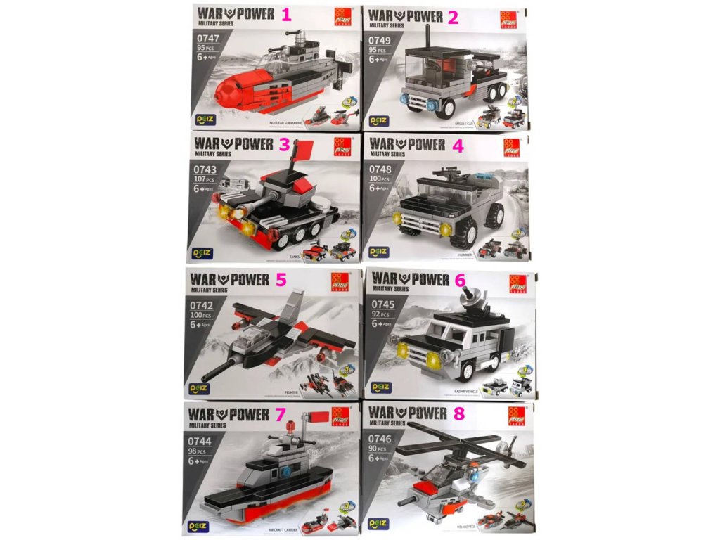 Plastová stavebnice s motivem vojenská technika. 8 různých variant (loď, tank, vrtulník, ponorka, automobil ...). 90-107 dílků.Připravte se na dobrodružství s kolekcí Military Series od Pheizi! Najdete v ní několik úžasných modelů, které můžete sestavit, sbírat a bavit se jako skutečný vojenský stratég. Díky odolným a vysoce kvalitním kostkám mohou děti stavět různé vojenské vozidla, z nichž každé má jedinečný vzhled a realistické detaily, které podněcují kreativitu a představivost.