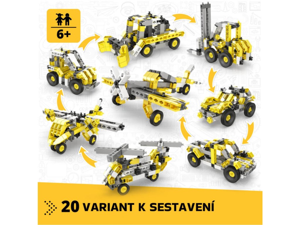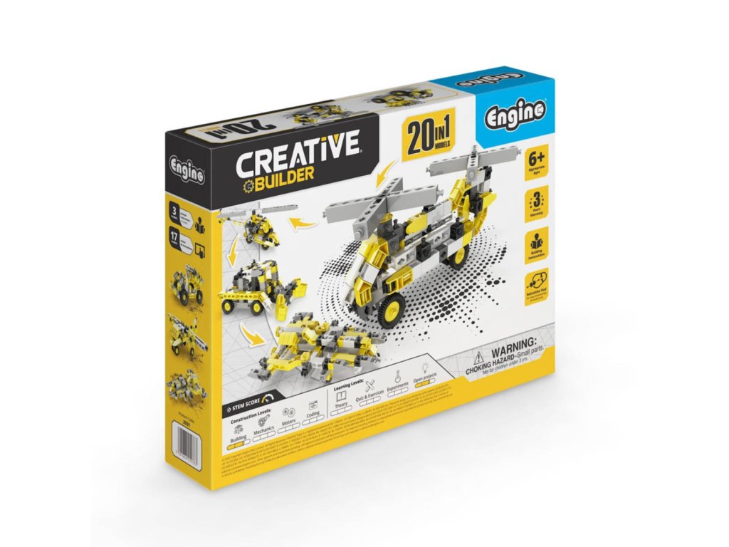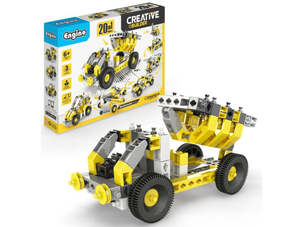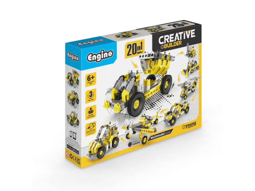 Stavebnice Engino Creative Builder 20 modelu je urcena detem od 6 let a nabízí široké možnosti tvorení díky 20 ruzným variantám modelu, které lze sestavit z jedné sady. Sada obsahuje dílky v kombinaci žluté, šedé, cerné a bílé barvy, které umožnují sestavit ruzné stroje a vozidla, jako jsou auta, letadla, vrtulníky ci vysokozdvižný vozík. Díky variabilnímu systému lze modely snadno prestavovat a rozvíjet tak manuální zrucnost a kreativitu detí.