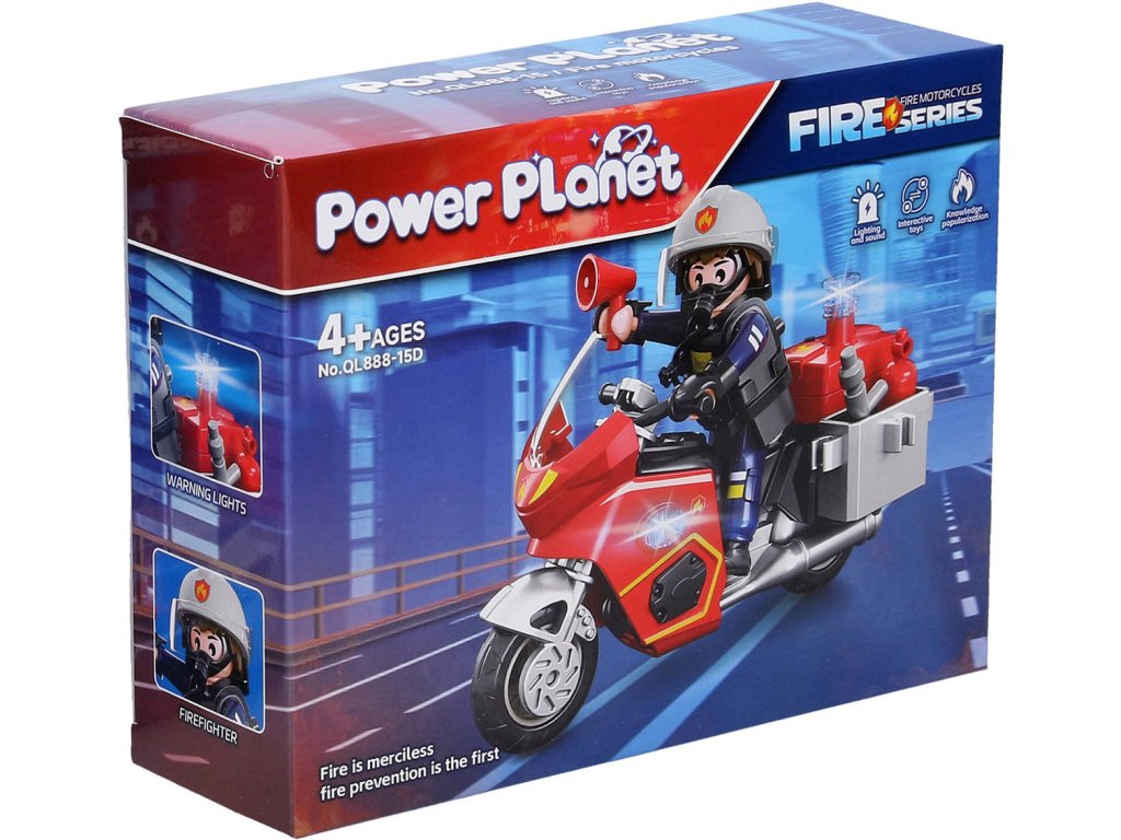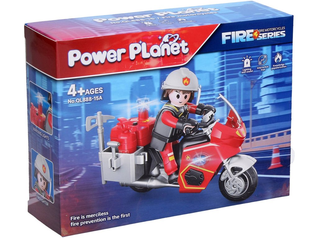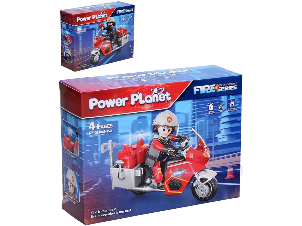 Obsah balení: dílky k sestavení figurky hasiče a motorky, doplňky, návod