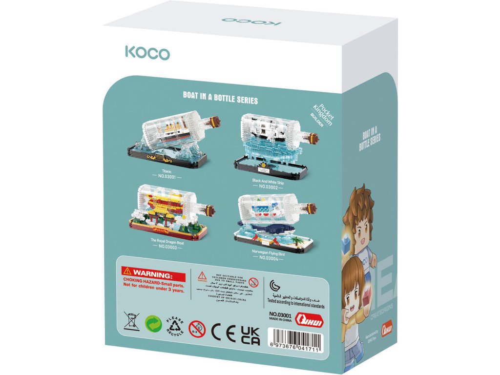 Plastová skládačka stavebnice mini KOCO: Titanic v láhvi. Malé kostičky, 918 dílků, 2 postavičky, velikost modelu 18 x 9 x 9cm.Stavebnice KOCO, to jsou velké příběhy v malých detailech. Sestavte si krásný model Titanicu v láhvi. Skvělý tip pro procvičení jemné motoriky rukou. Balení obsahuje podrobný obrázkový návod.