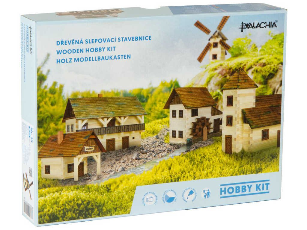 Ve stavebnicích WALACHIA® naleznete vše potřebné k sestavení. Jsou zde uloženy dřevěné hranolky o průřezu 9x9mm daných délek ke stavbě roubených stěn, díly na štíty a střechy, kartónové výseky oken a dveří i papírovépotisky, plochy štítů, střech, stříšek, dveří, oken a dlažeb, folie oken a brusný papír na opracování dřevěných dílů ( kvalita ploch však opracování potřebuje minimálně ). Součástí stavebnice je podrobný piktogramový montážní