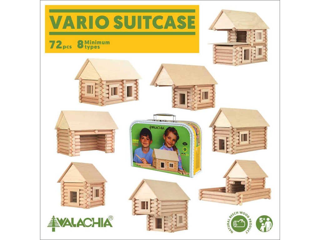 Dřív jsme do oblíbených kufříků schovávali panenky a autíčka, dnes vás v něm čeká 72 dílů stavebnice, ze kterých můžete postavit 10 různých staveb.Stavebnice VARIO obsahuje skládací a rozkládací modely staveb, zhotovené z hlazených bukových kulatin o průměru 15 mm, v délkách od 28 do 250 mm, opatřených frézovanými půlkulatými