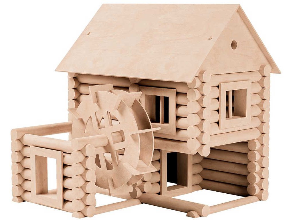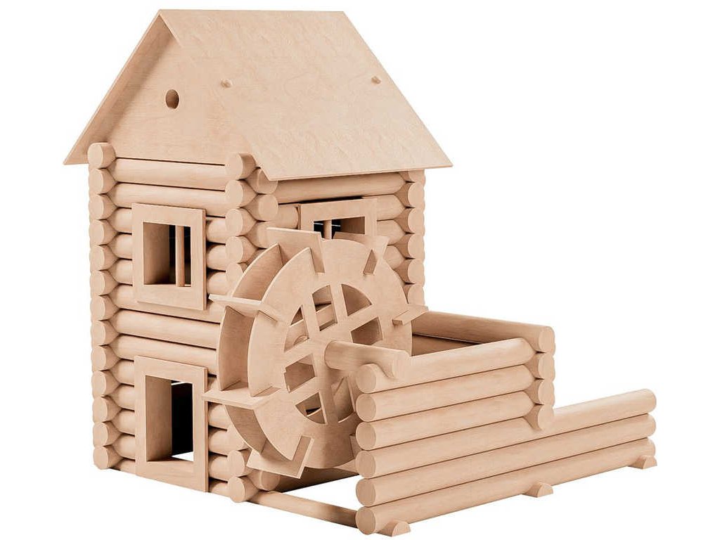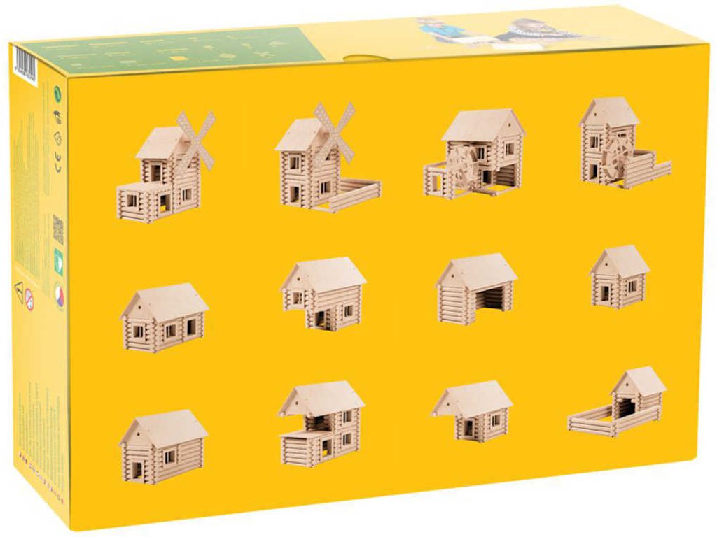 zámky. Jsou navzájem kompatibilní a umožňují postavit desítky variant staveb. Okna a dveře, slepené z masivních profilů, se vkládají do stěn staveb. Jsou uloženy v pevných kartónových krabicích,