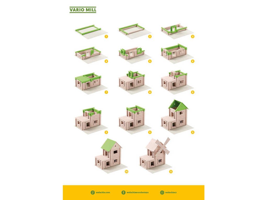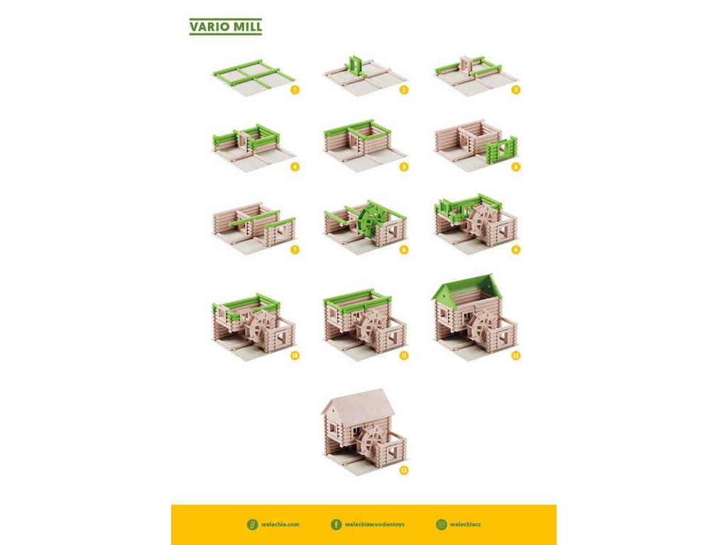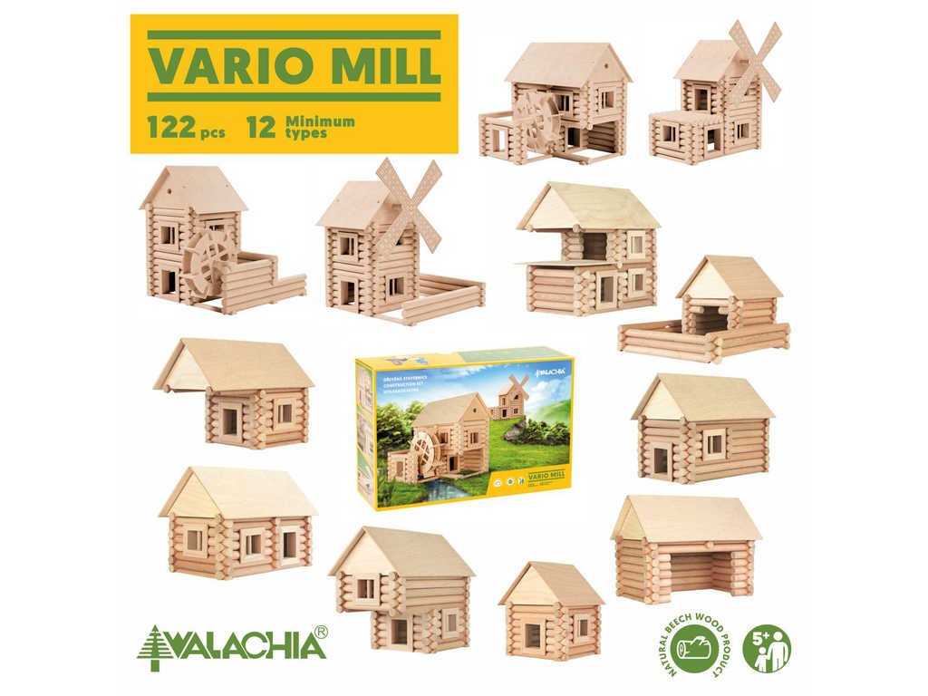 WALACHIA stavebnice z řady Vario, ze které si můžete poskládat až 12 různých modelů mlýna.Větrný, vodní, větrný, vodní. Skládejte a stále dokola rozkládejte dřevěnou stavebnici VARIO MILL, ze které můžete sestavit větrný i vodní mlýn. Jednotlivé díly jsou kompatibilní s ostatními