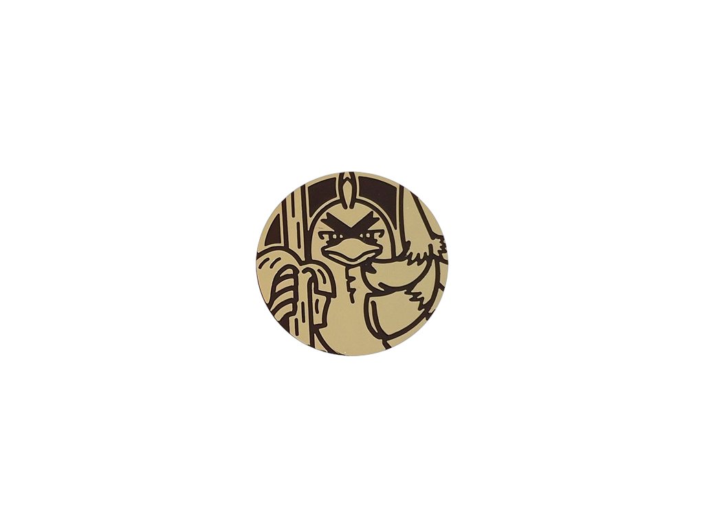 Tato mince představuje profil Sirfetch'da, hrdého bojového Pokémona z regionu Galar, který je známý svým obřím pórkovým mečem a štítem. Mince pochází z podzimní sady Silver Tempest (2022) a díky svému zlatému provedení patří k těm vizuálně nejatraktivnějším kouskům. Zlatý povrch hází při dopadu na herní podložku krásné odlesky a na světle nádherně vynikne.